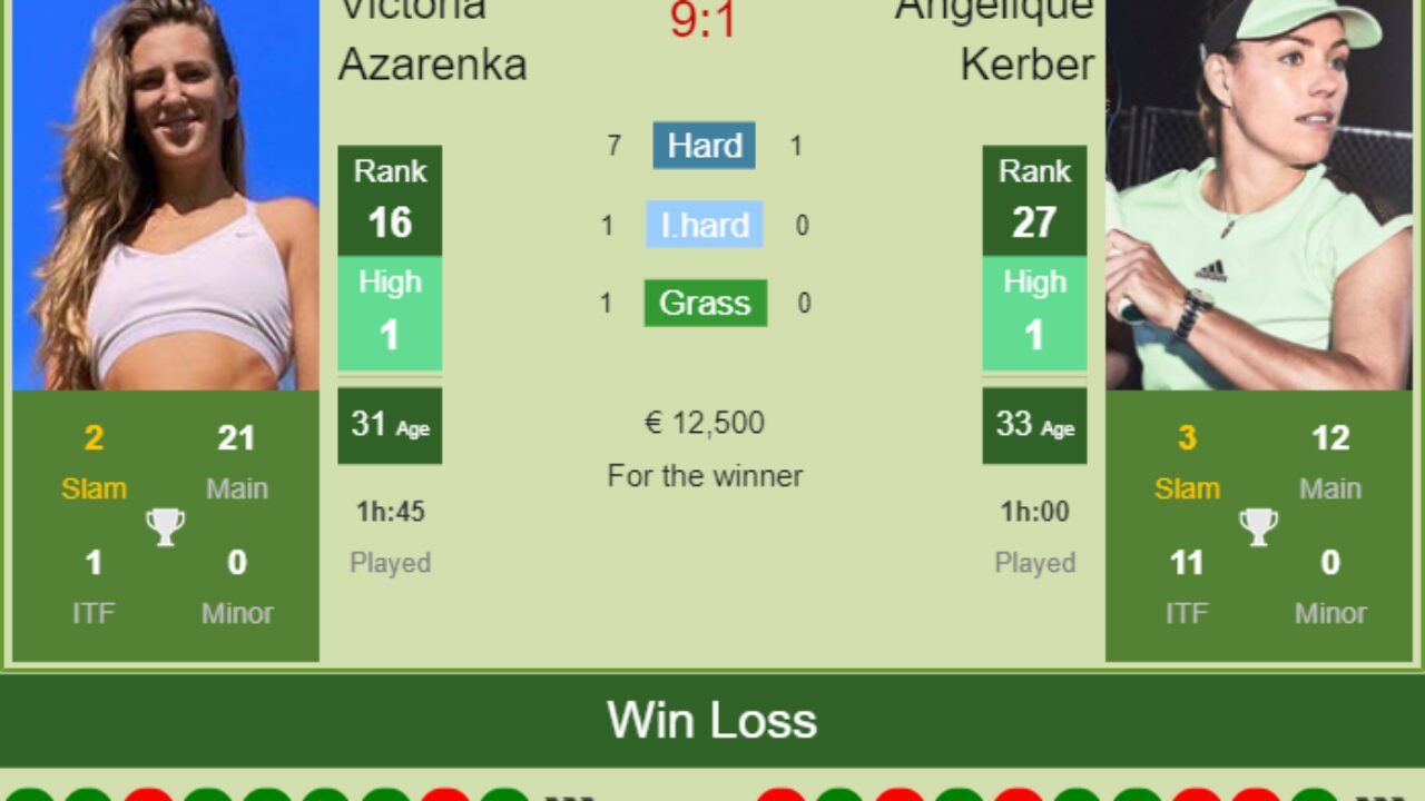 Preview head to head and prediction for the upcoming match of Angelique Kerber vs Victoria Azarenka. Victoria Azarenka vs Angelique Kerber head-to-head. Its an old rivalry but has been a lopsided one with Azarenka leading 9-1 head to head.